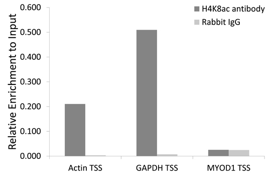 Chromatin immunoprecipitation analysis extracts of 293 cell line, using H4K8ac antibody and rabbit IgG. The amount of immunoprecipitated DNA was checked by quantitative PCR. Histogram was constructed by the ratios of the immunoprecipitated DNA to the input.
