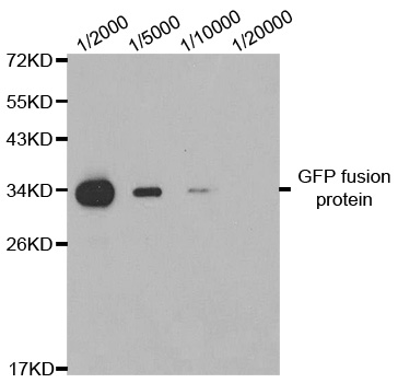 Protein tags are protein or peptide sequences located either on the C- or N- terminal of the target protein, which facilitates one or several of the following characteristics: solubility, detection, purification, localization and expression. Green fluorescence protein(GFP) is a protein composed of 238 amino acid residues(26.9kDa) derived from the Jellyfish Aequorea victoria, which emits green light(emission peak at 509nm) when excited by blue light(excitation peak at 395nm). GFP has become an invaluable tool in cell biology research, since its intrinsic fluorescence can be visualized in living cells. EGFP contains the double-amino-acid substitutions Phe-64 to Leu and Ser-65 to Thr(previously published as GFPmut1; PMID: 8707053). In contrast to wtGFP, EGFP has a single, strong, red-shifted excitation peak at 488nm. GFPmut1 fluoresces 35-fold more intensely than wtGFP when excited at 488nm, due to an increase in its extinction coefficient(Em). This antibody is a rabbit polyclonal antibody raised against full-length eGFP and reactive against all variants of Aequorea victoria GFP such as S65T-GFP, RS-GFP, YFP, CFP and eGFP.