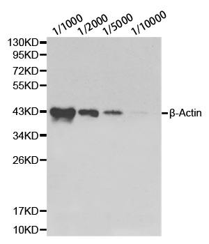 Beta Actin, also named as ACTB and F-Actin, belongs to the actin family. Actins are highly conserved globular proteins that are involved in various types of cell motility and are ubiquitously expressed in all eukaryotic cells. At least six isoforms of actins are known in mammals and other vertebrates: alpha ( ACTC1, cardiac muscle 1), alpha 1 ( ACTA1, skeletal muscle) and 2 ( ACTA2, aortic smooth muscle), beta ( ACTB), gamma 1 ( ACTG1) and 2 ( ACTG2, enteric smooth muscle). Beta and gamma 1 are two non-muscle actin proteins. Most actins consist of 376aa, while ACTG2 (rich in muscles) has 375aa and ACTG1(found in non-muscle cells) has only 374aa. Beta Actin has been widely used as the internal control in RT-PCR and Western Blotting as a 42-kDa protein. This antibody was generated by full length beta actin protein and can cross-react with other actins.