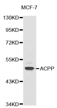 ACPP is also named as PAP(prostatic acid phosphatase),5'-nucleotidase,thiamine monophosphatas and Belongs to the histidine acid phosphatase family.This enzyme is a homodimeric glycoprotein with a subunit molecular mass of 50 kDa and is an androgen-stimulated secretory product of the human prostate gland(PMID:8132635).It is also a non-specific phosphatase and has been implicated in the progression of prostate cancer, which inactivates LPA in human seminal plasma(PMID:15280042). This protein has three glycosylation sites(PMID:10639192;12525165). This antibody is specific to ACPP.