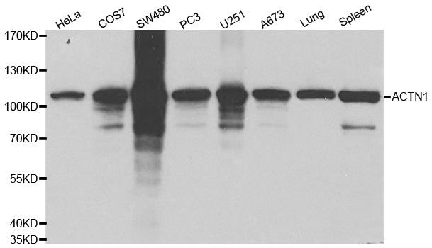 Western blot analysis of extracts of various cell lines using ACTN1 antibody.