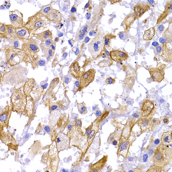 Immunohistochemistry of paraffin-embedded human prostate using ATP1A1 antibody at dilution of 1:100 (x40 lens).