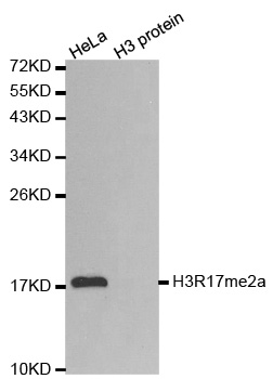 Western blot analysis of extracts of HeLa cell line and H3 protein expressed in E.coli., using H3R17me2a antibody.