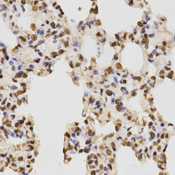 Immunohistochemistry of paraffin-embedded rat lung tissue using H3R17me2a antibody at dilution of 1:200 (x400 lens)