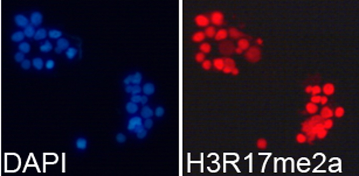 Immunofluorescence analysis of 293T cell using H3R17me2a antibody. Blue: DAPI for nuclear staining.
