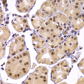 Immunohistochemistry of paraffin-embedded human stomach using BCL2 antibody at dilution of 1:100 (x40 lens).