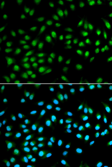 Immunofluorescence analysis of A549 cell using BCL2 antibody. Blue: DAPI for nuclear staining.