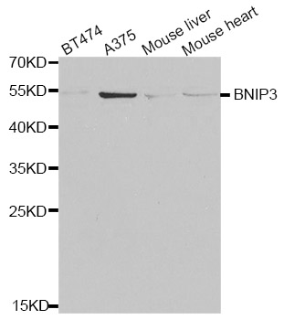 Western blot analysis of extracts of various cell lines, using BNIP3 antibody.