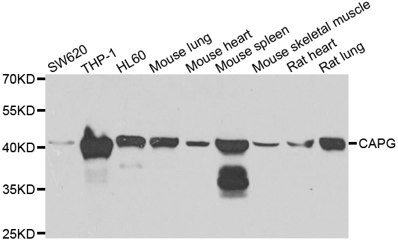 Western blot analysis of extracts of various cell lines, using CAPG antibody.