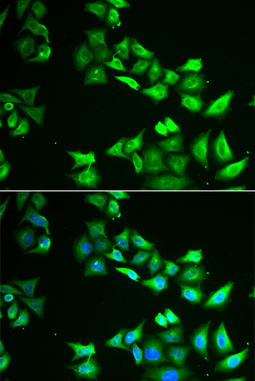 Immunofluorescence analysis of HeLa cell using CCBL1 antibody. Blue: DAPI for nuclear staining.