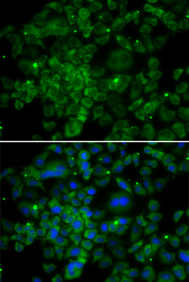 Immunofluorescence analysis of MCF7 cell using CCL2 antibody. Blue: DAPI for nuclear staining.