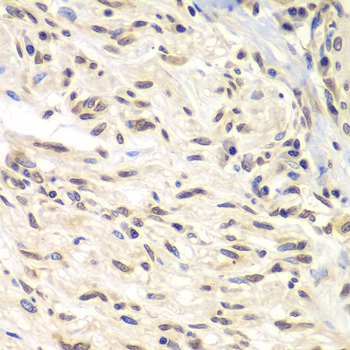 Immunohistochemistry of paraffin-embedded human gastric cancer using CHEK1 antibody at dilution of 1:100 (x40 lens).