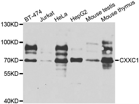 Western blot analysis of extracts of various cell lines, using CXXC1 antibody.