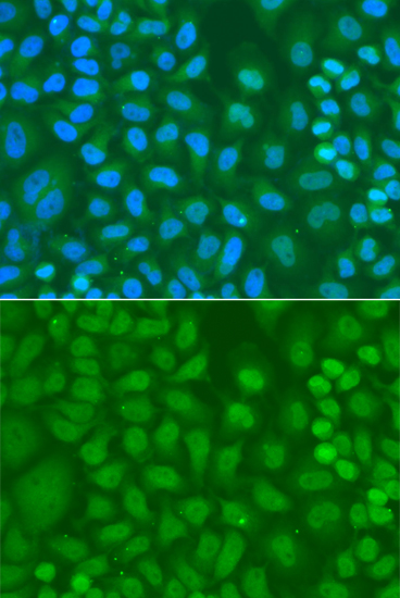 Immunofluorescence analysis of A549 cell using CXXC1 antibody. Blue: DAPI for nuclear staining.