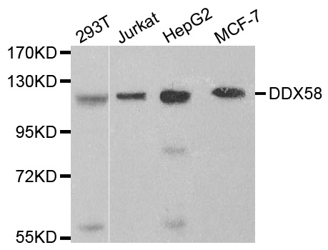 Western blot analysis of extracts of various cell lines, using DDX58 antibody.
