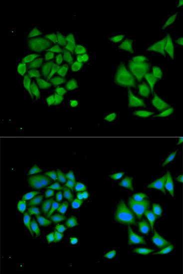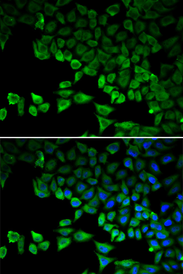 Immunofluorescence analysis of HeLa cell using DDX58 antibody. Blue: DAPI for nuclear staining.