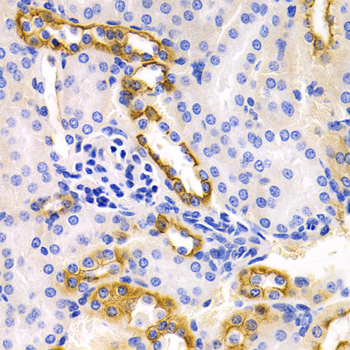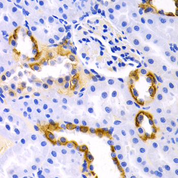 Immunohistochemistry of paraffin-embedded rat kidney using DRD1 antibody at dilution of 1:200 (400x lens).