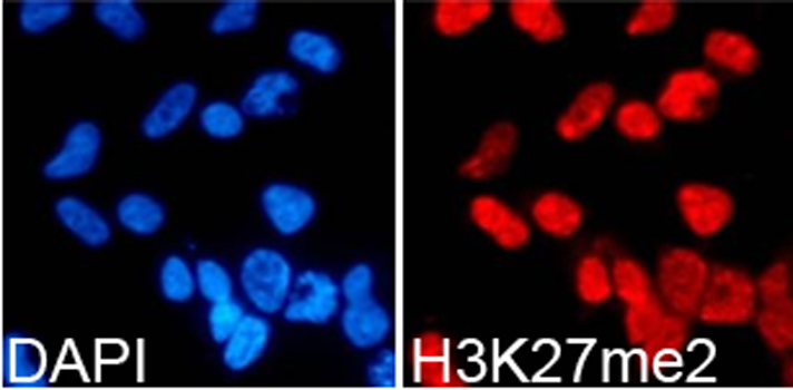 Immunofluorescence analysis of 293T cell using H3K27me2 antibody. Blue: DAPI for nuclear staining.