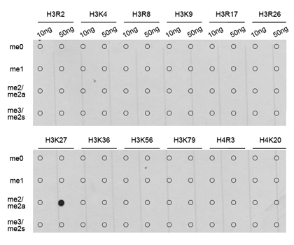 Dot-blot analysis of all sorts of methylation peptides using H3K27me2 antibody.