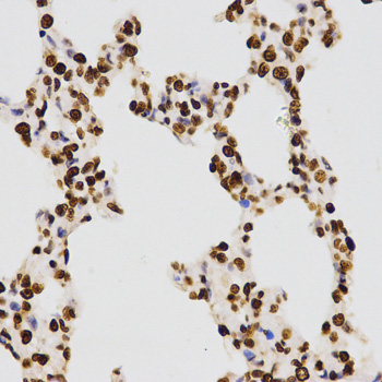 Immunohistochemistry of paraffin-embedded Mouse lung using H3K27me2 antibody at dilution of 1:100 (x400 lens).