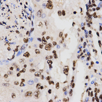 Immunohistochemistry of paraffin-embedded human lung cancer tissue using H3K27me2 antibody at dilution of 1:200 (x400 lens).
