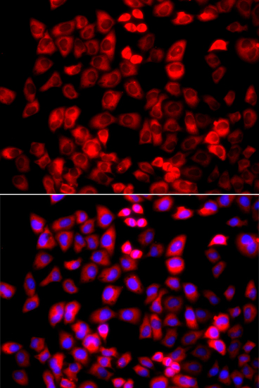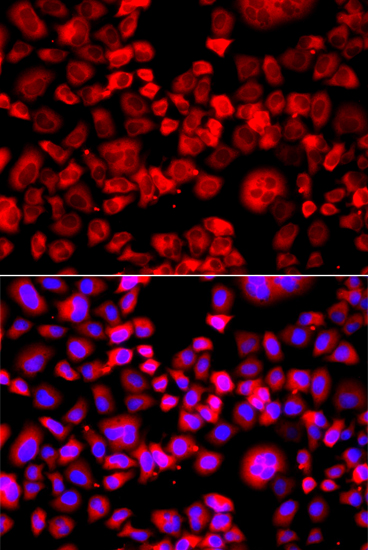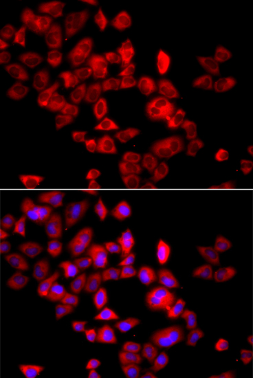 Immunofluorescence analysis of A549 cell using EIF4G1 antibody. Blue: DAPI for nuclear staining.