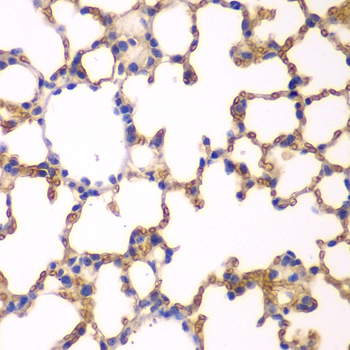 Immunohistochemistry of paraffin-embedded mouse lung using EPB41 antibody at dilution of 1:200 (400x lens).
