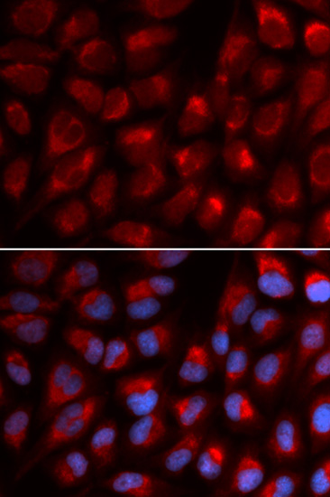 Immunofluorescence analysis of U2OS cell using EPB41 antibody. Blue: DAPI for nuclear staining.