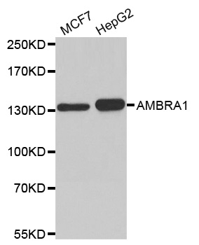 WD-repeats are motifs that are found in a variety of proteins and are characterized by a conserved core of 40-60 amino acids that commonly form a tertiary propeller structure. While proteins that contain WD-repeats participate in a wide range of cellular functions, they are generally involved in regulatory mechanisms concerning chromatin assembly, cell cycle control, signal transduction, RNA processing, apoptosis and vesicular trafficking. AMBRA1 (Activating molecule in BECN1-regulated autophagy protein 1), also known as WDR94 or KIAA1736, is a 1,298 amino acid protein that contains three WD repeats. Localized to cytoplasmic vesicles, AMBRA1 functions to control protein turnover, cell proliferation and cell survival during neuronal development, thereby playing an important role in autophagy and the development of the nervous system. Multiple isoforms of AMBRA1 exist due to alternative spicing events.