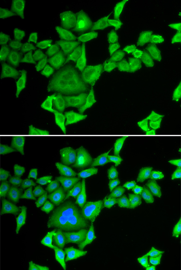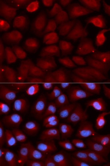 Immunofluorescence analysis of A549 cell using FMR1 antibody. Blue: DAPI for nuclear staining.