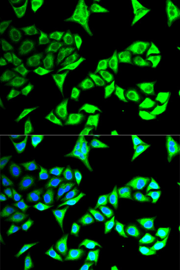 Immunofluorescence analysis of MCF-7 cell using GABARAP antibody. Blue: DAPI for nuclear staining.