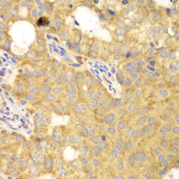 Immunohistochemistry of paraffin-embedded human oophoroma using GNB2L1 antibody at dilution of 1:100 (400x lens).