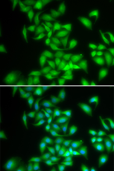 Immunofluorescence analysis of U20S cell using HIP1 antibody. Blue: DAPI for nuclear staining.