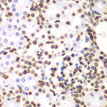 Immunohistochemistry of paraffin-embedded human liver cancer tissue using Histone H3 antibody at dilution of 1:200 (x400 lens).