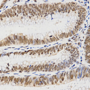 Immunohistochemistry of paraffin-embedded human rectal cancer tissue using Histone H3 antibody at dilution of 1:200 (x400 lens).