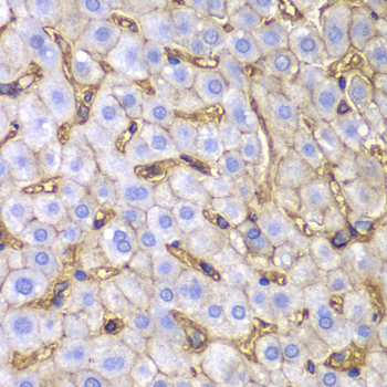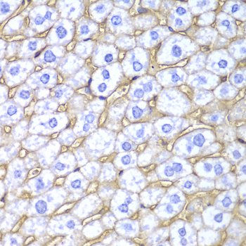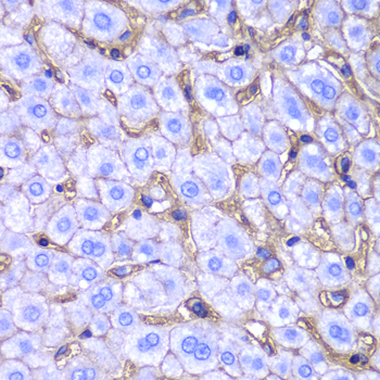 Immunohistochemistry of paraffin-embedded mouse liver using HLA-A antibody at dilution of 1:100 (400x lens).