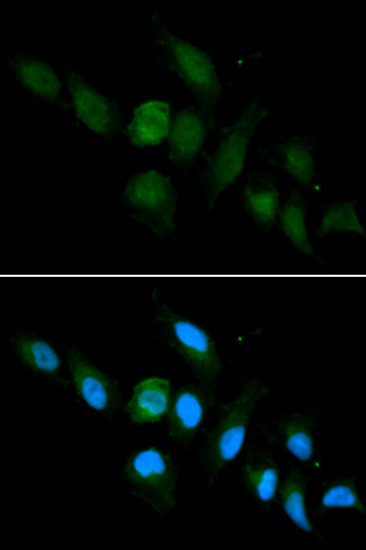 Immunofluorescence analysis of U2OS cell using HLA-A antibody. Blue: DAPI for nuclear staining