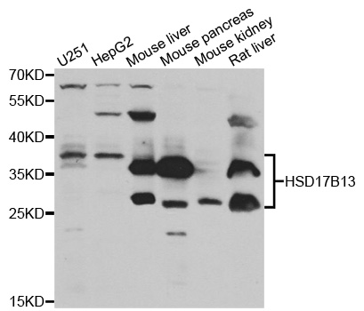 Western blot analysis of extracts of various cell lines, using HSD17B13 antibody.
