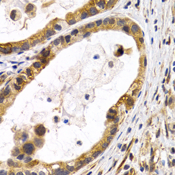 Immunohistochemistry of paraffin-embedded human colon cancer using HSPB8 antibody at dilution of 1:200 (400x lens).