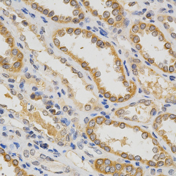 Immunohistochemistry of paraffin-embedded human kidney using IFNB1 antibody at dilution of 1:200 (x400 lens)