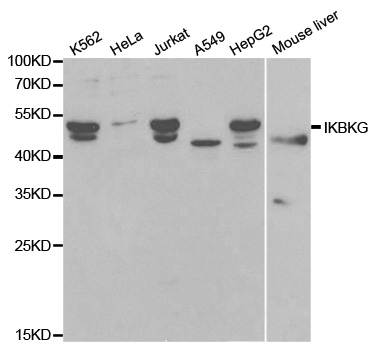 Western blot analysis of extracts of various cell lines, using IKBKG antibody.