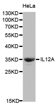IL-12 alpha is a subunit of a cytokine that acts on T and natural killer cells, and has a broad array of biological activities. The cytokine is a disulfide-linked heterodimer composed of the 35-kD subunit protein (IL-12 alpha), and a 40-kD subunit (IL-12 beta) that is a member of the cytokine receptor family. This cytokine is required for the T-cell-independent induction of interferon (IFN)-gamma, and is important for the differentiation of both Th1 and Th2 cells. The responses of lymphocytes to this cytokine are mediated by the activator of transcription protein STAT4. Nitric oxide synthase 2A (NOS2A/NOS2) is found to be required for the signaling process of this cytokine in innate immunity (1).