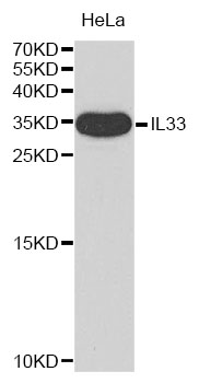 Western blot analysis of extracts of HeLa cell line, using IL33 antibody.