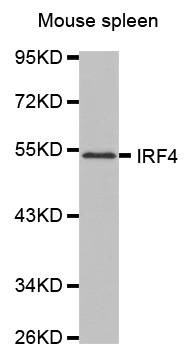 Interferon regulatory factor 4 (IRF4) is a member of the IRF family of transcription factors, expressed in most cell types of the immune system. IRF4 is a transcription factor essential for the development of T helper-2 (Th2) cells, IL17-producing Th17 cells, and IL9-producing Th9 cells, as well as dendritic cell (DC). It binds to and activates the interferon-stimulated response element (ISRE) of the MHC class I promoter, and may have a role in ISRE-targeted signal transduction mechanisms specific to lymphoid cells.