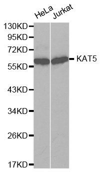 KAT5 belongs to the MYST protein family that contains atypical zinc finger and histone acetyltransferase domains. Also, KAT5 contains a chromodomain. KAT5 is a catalytic subunit of the NuA4 histone acetyltransferase complex. The NuA4 HAT complex plays a role in transcriptional activation of select genes mainly by acetylation of nucleosomal histone H4 and H2A, which influence nucleosome-DNA interaction and promotes interaction of the modified histones with other proteins that could regulate transcription positively. This complex also involves in the activation of transcriptional programs associated with oncogene and proto-oncogene mediated growth induction, tumor suppressor mediated growth arrest and replicative senescence, DNA repair and apoptosis.