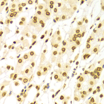 Immunohistochemistry of paraffin-embedded human kidney cancer using LMNA antibody at dilution of 1:200 (x400 lens).