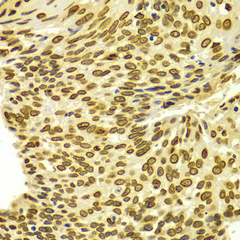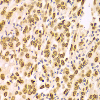 Immunohistochemistry of paraffin-embedded human esophageal cancer using LMNA antibody at dilution of 1:100 (x400 lens).