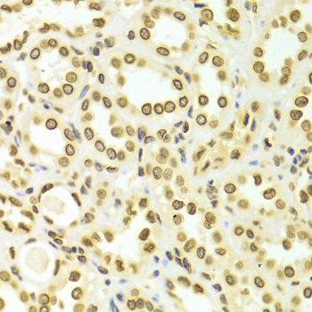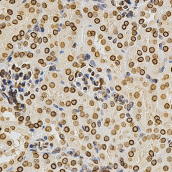 Immunohistochemistry of paraffin-embedded Human kidney using LMNA antibody at dilution of 1:100 (x400 lens).