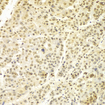 Immunohistochemistry of paraffin-embedded liver cancer using LMNA antibody at dilution of 1:100 (x400 lens).