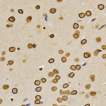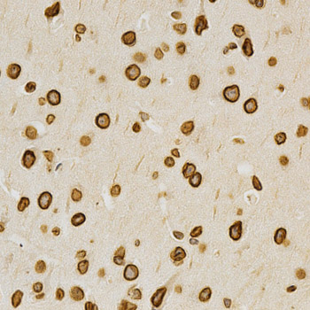 Immunohistochemistry of paraffin-embedded rat brain using LMNA antibody at dilution of 1:200 (x400 lens).